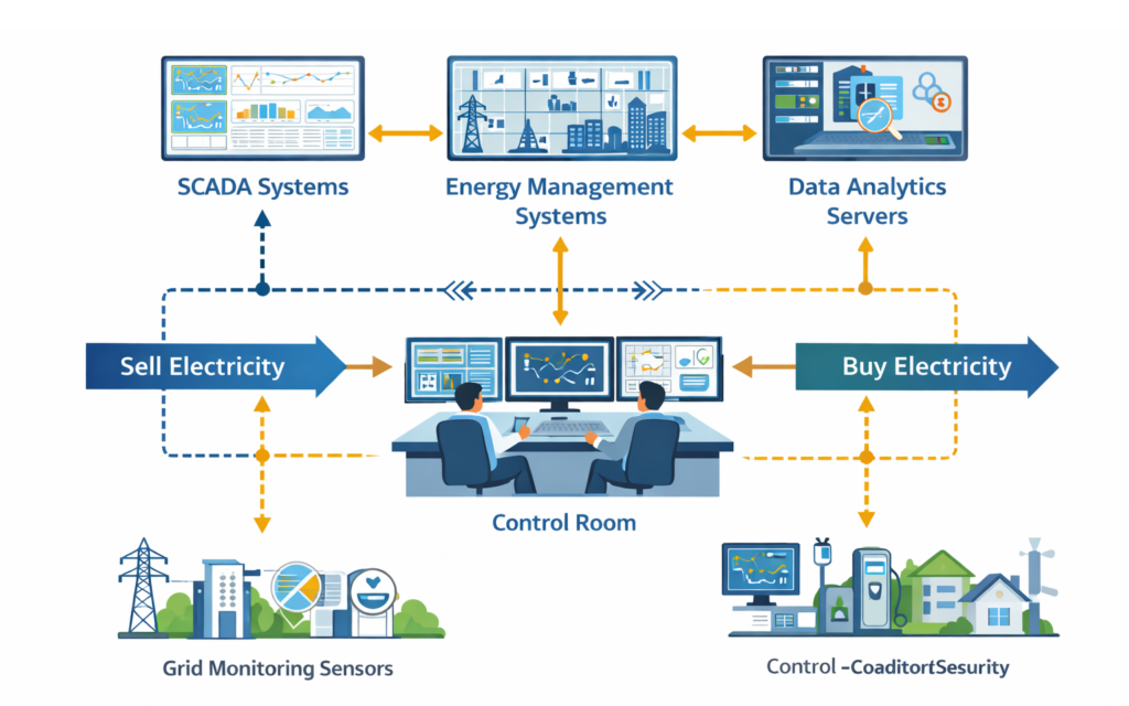- Network monitoring using SCADA and Energy Management Systems (EMS) for real-time grid visibility.